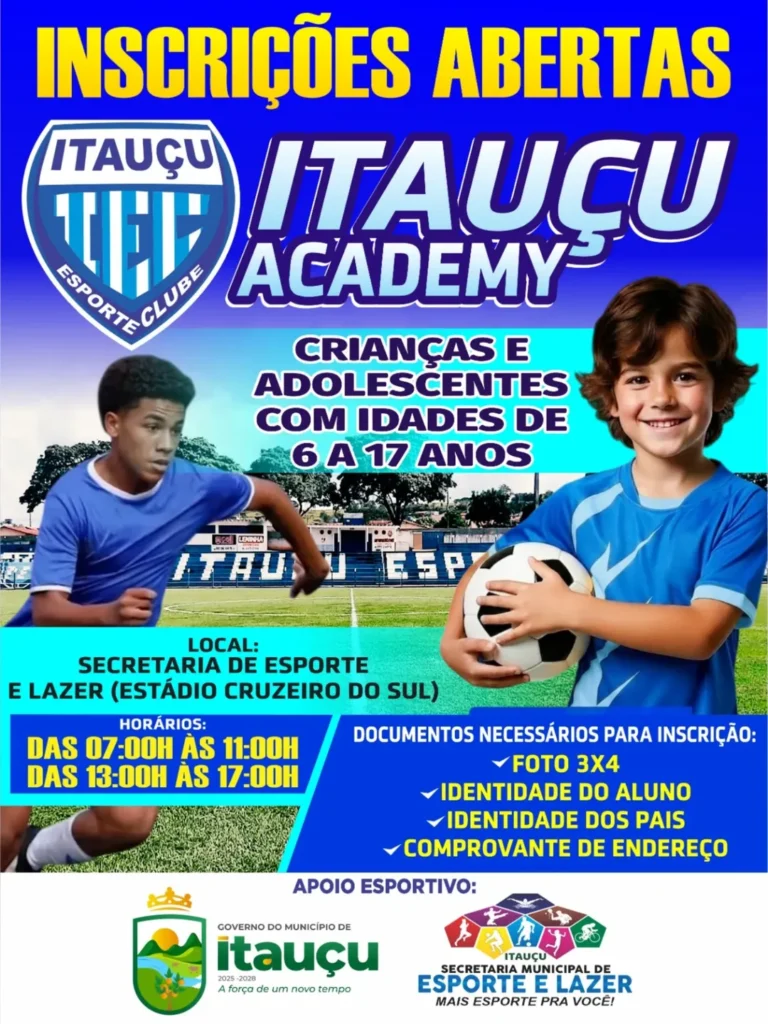 Atenção, Itauçu! As inscrições para a Itauçu Academy estão OFICIALMENTE ABERTAS! Muito mais do que futebol, nós ensinamos disciplina, trabalho em equipe e formamos cidadãos para o futuro. 💙🤍